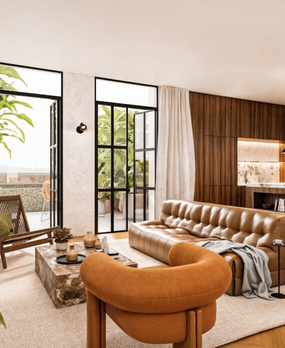 Three exclusive top-level residences with private terraces and direct access to the rooftop social area.