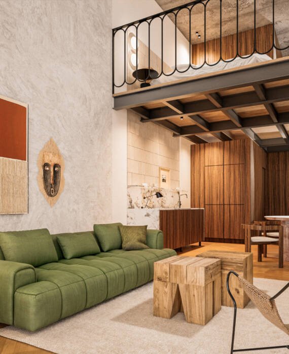 Double-height lofts with mezzanine bedrooms and flexible layouts, designed for urban living and short-term rental performance in Plaza Herrera.